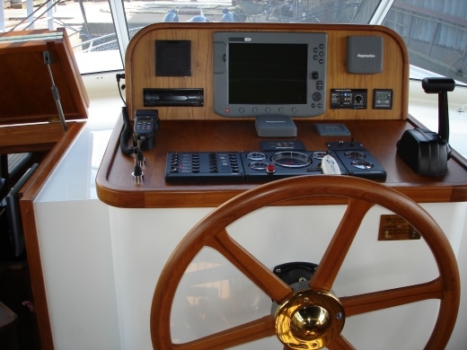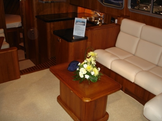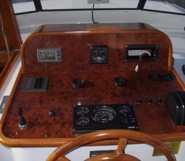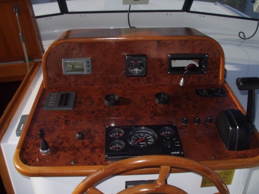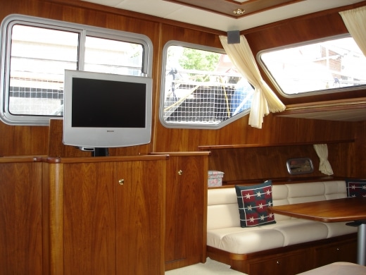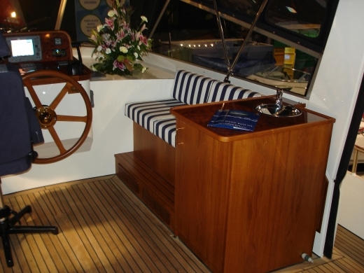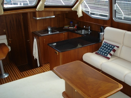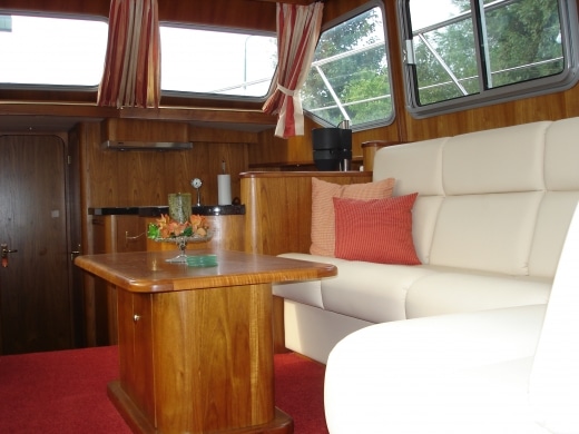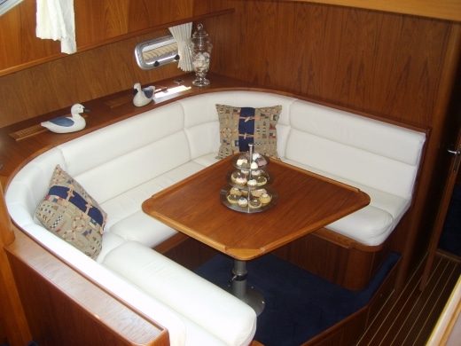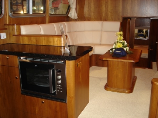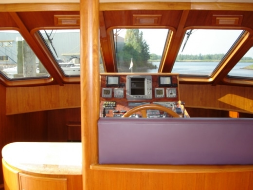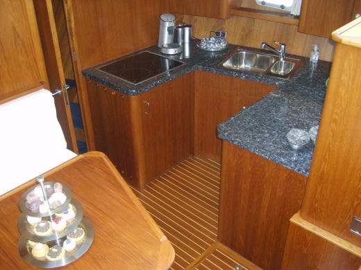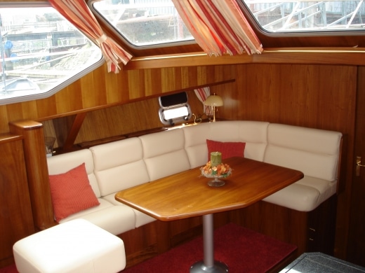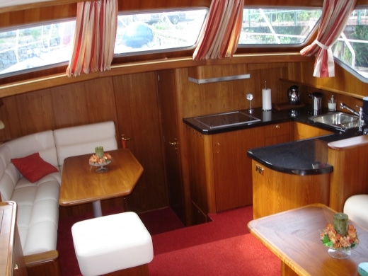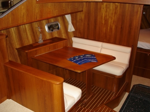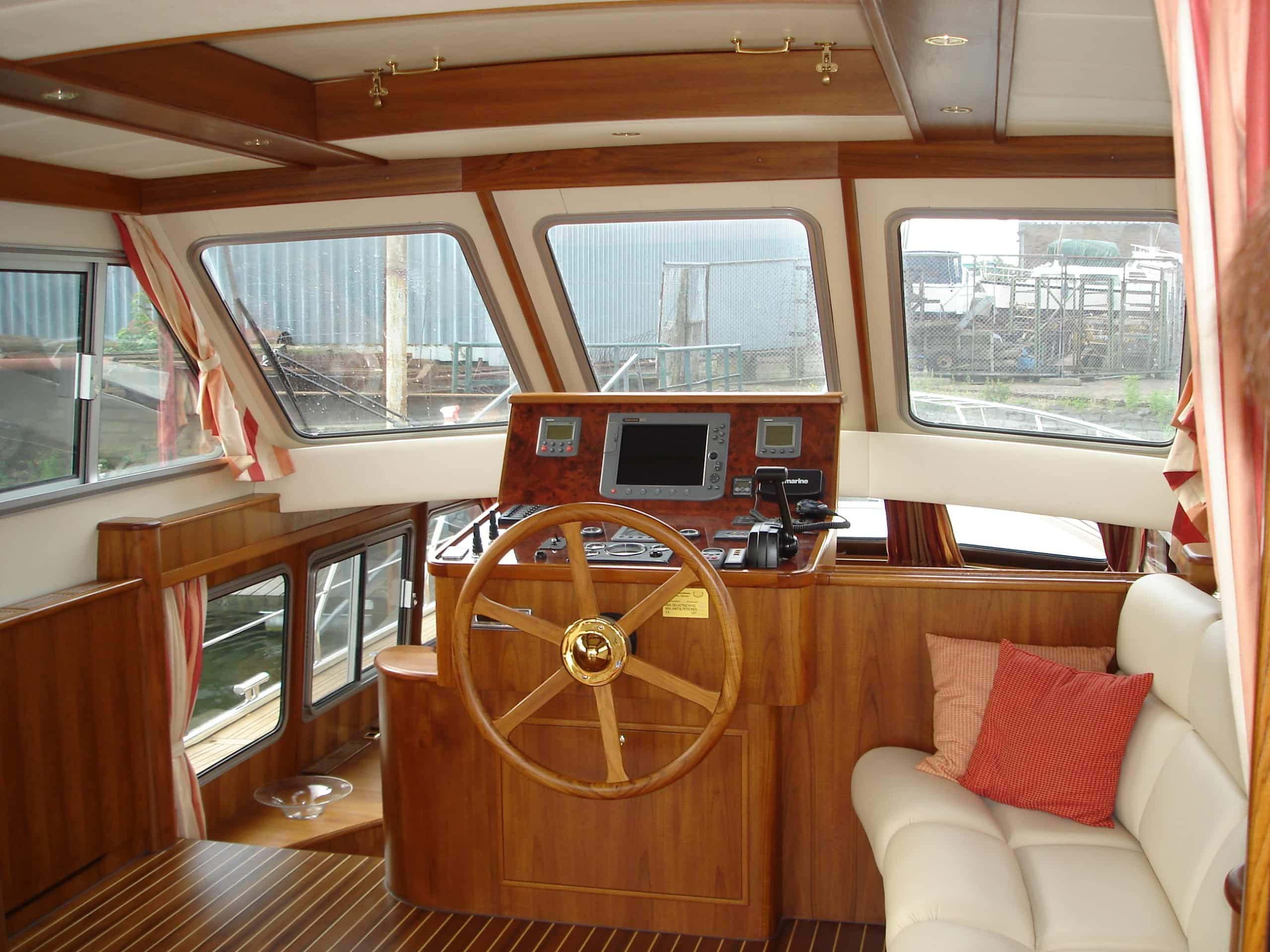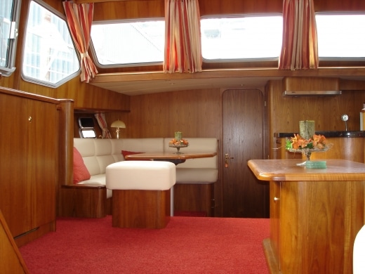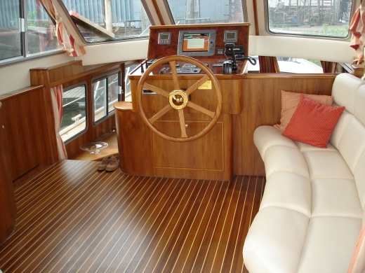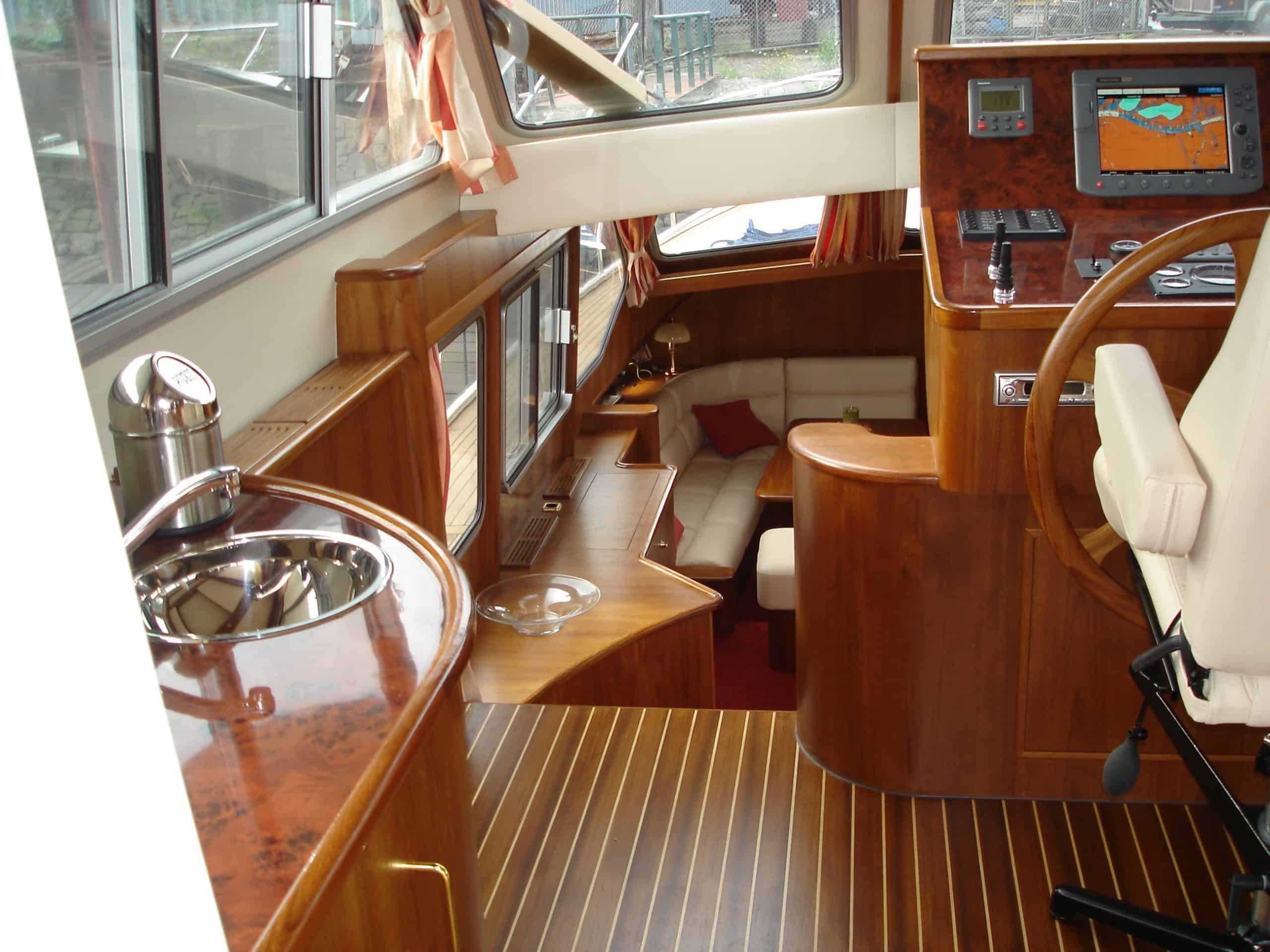 Onderdeks biedt dit jacht een prachtige teak betimmering.